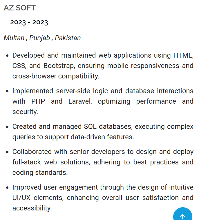 Hello, my name is Arslan Jhangir. I am passionate and results-driven Web Developer with a strong foundation in creating dynamic, responsive, and user-centric web applications. Proficient in front-end and back-end technologies, including HTML, CSS, JavaScript, PHP, LARAVEL, and databases like SQL. Experienced in collaborating with cross-functional teams to deliver high-quality digital solutions that enhance user experiences and meet business goals. Adept at leveraging modern development frameworks and tools to build scalable and efficient web applications. Dedicated to continuous learning and staying updated with the latest industry trends and best practices.
